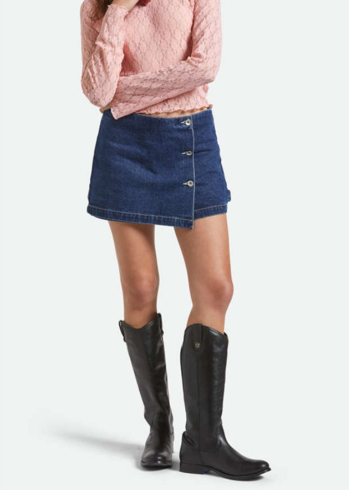 The Brixton Denim Wrap Skort in Rinse Denim combines the classic appeal of a denim skirt with the comfort and practicality of shorts. Featuring Carhartt-inspired details, adjustability in the waist, a secure button and zip closure, this 100% cotton skort offers a stylish, high-trending look perfect for any occasion. Experience the best of both worlds—business in the front, party in the back—with a versatile piece designed for effortless style and all-day comfort.