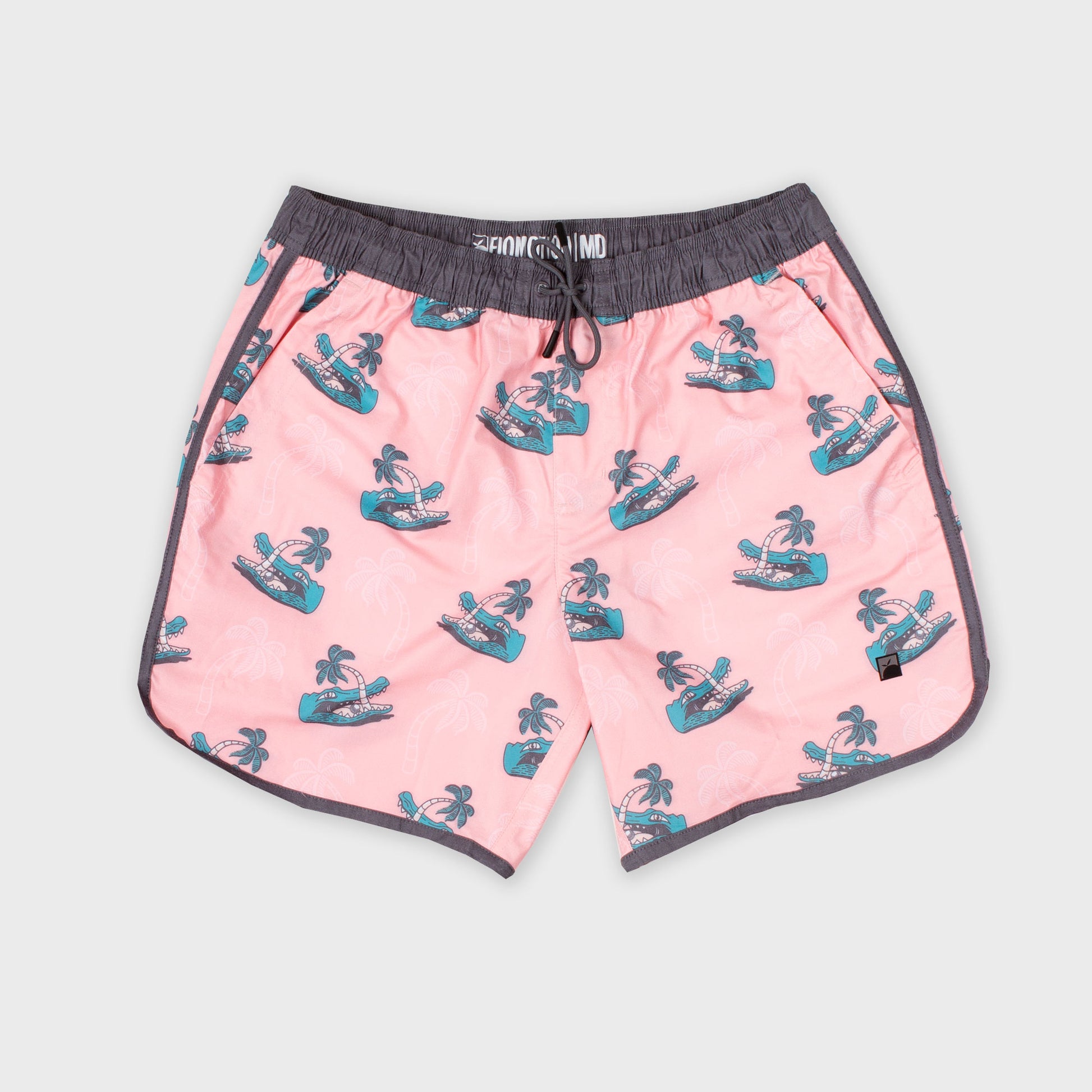 Make a splash with Flomotion Chubs Volley Boardshorts in Coral! These boardshorts feature a unique design of Florida gators and palm trees, perfect for your next summer adventure. Don't just blend in, stand out with Flomotion!