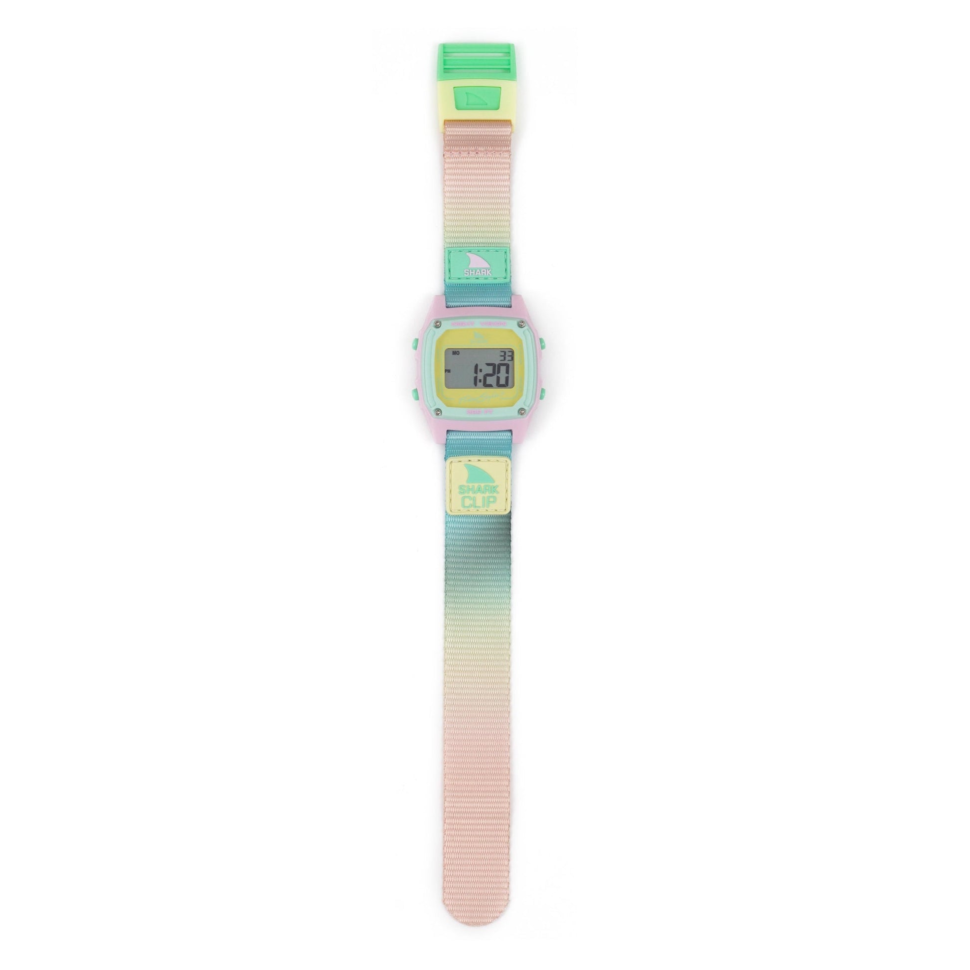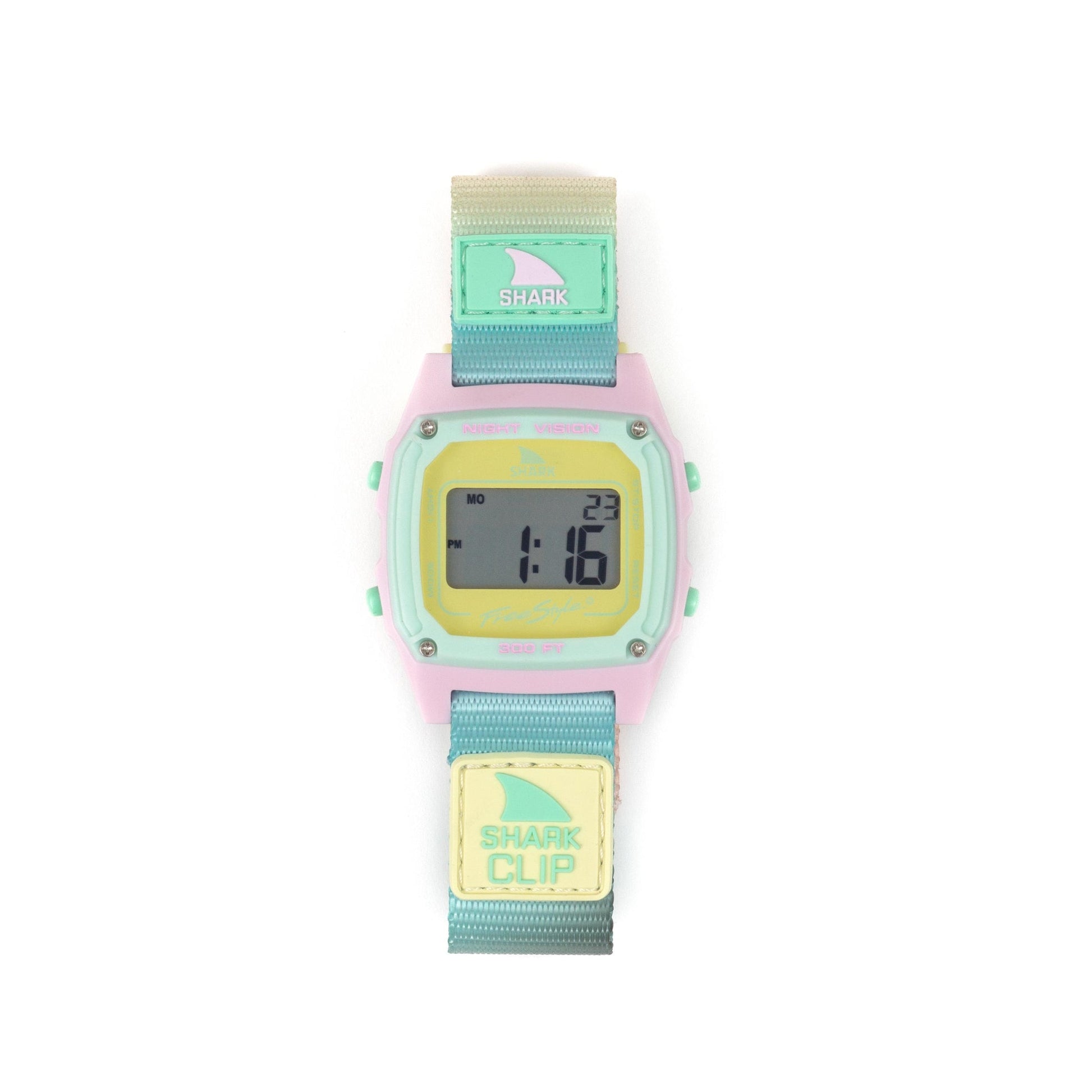 Soft pastels and ocean hues come together in the Scenic Sky digital watch, inspired by the way the sky melts into the horizon at sunset. Its smooth gradient strap and fresh color palette make it the perfect blend of calm and adventure. Designed for life on land and in the water, it features Freestyle’s Shark Clip closure, 300 feet of water resistance, and all the essentials—night vision backlight, dual time, alarms, and a stopwatch.
