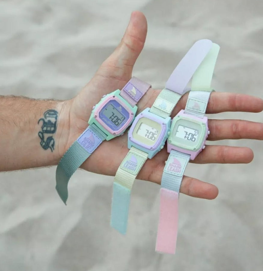 They're Back. The original Leash band that ignited Freestyle Watches in the late '80s is back and better than ever. The shark leash's hook and loop closure system is modeled after an '80s style surfboard leash, and is ready to get radical. The Shark Leash comes loaded with standard digital features like time, date, stopwatch, countdown timer, alarm and night vision backlight. Like all Freestyle Watches, The Shark Leash is water resistant to 100 Meters and backed by our limited lifetime warranty. Shark to the Future!