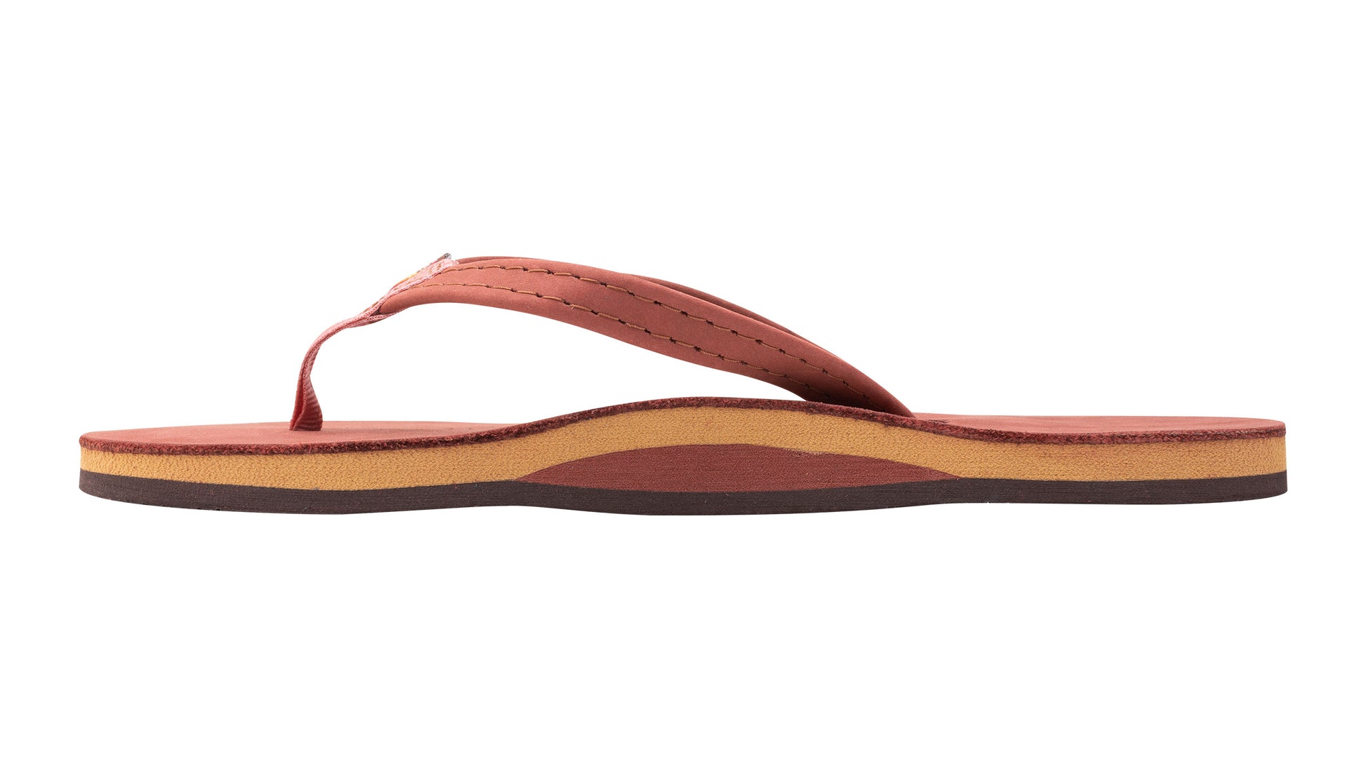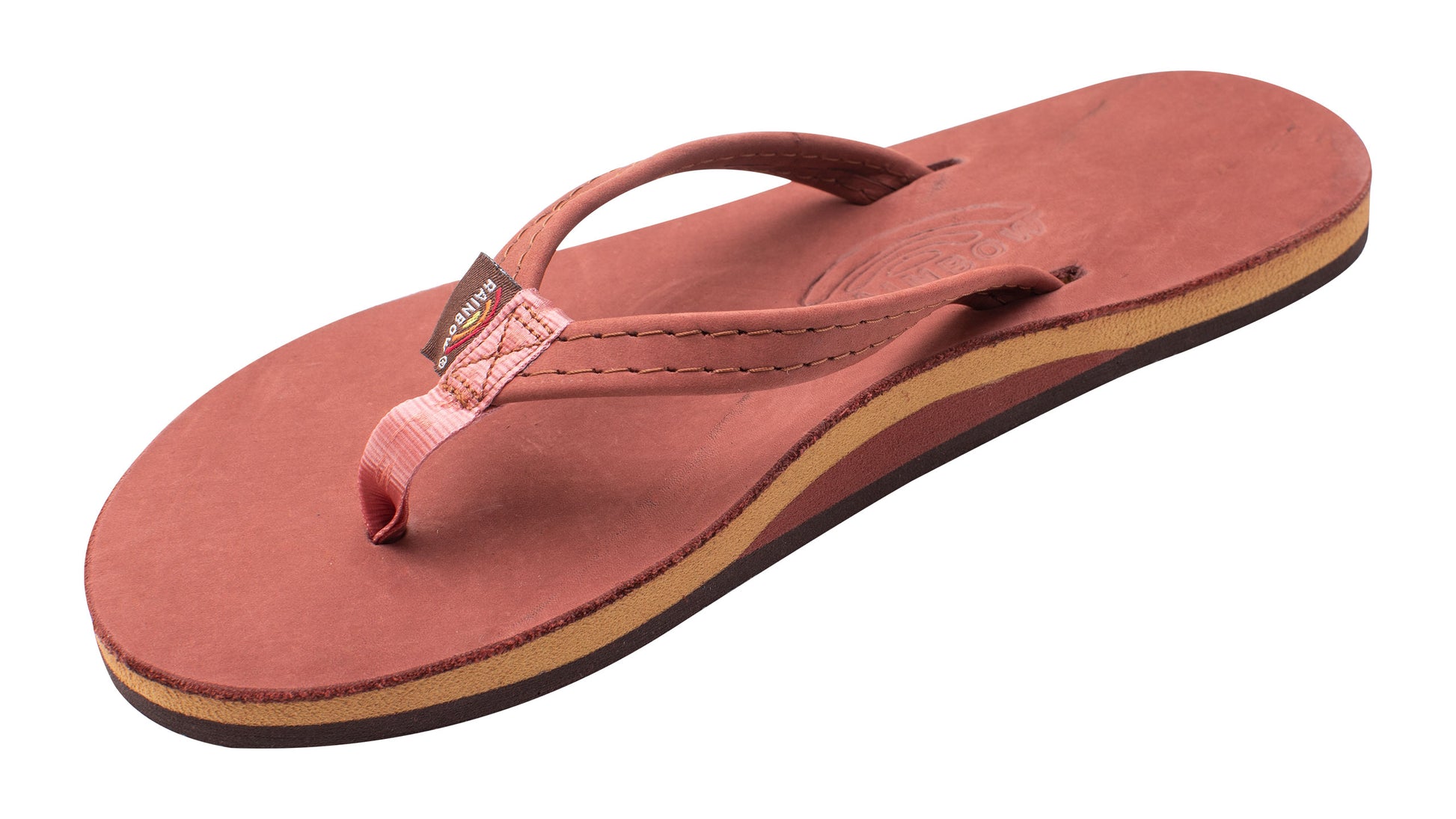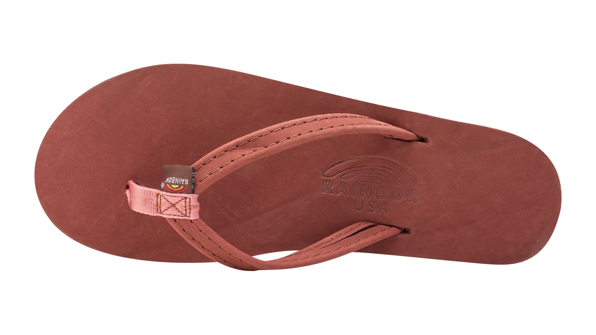 The single layer premier leather sandal is made with top grade nubuck leather; the top sole is embossed with the Rainbow® logo. The strap, also nubuck leather; is double stitched, and the nylon toe piece is secured with a box X stitch, all using bonded nylon thread.
