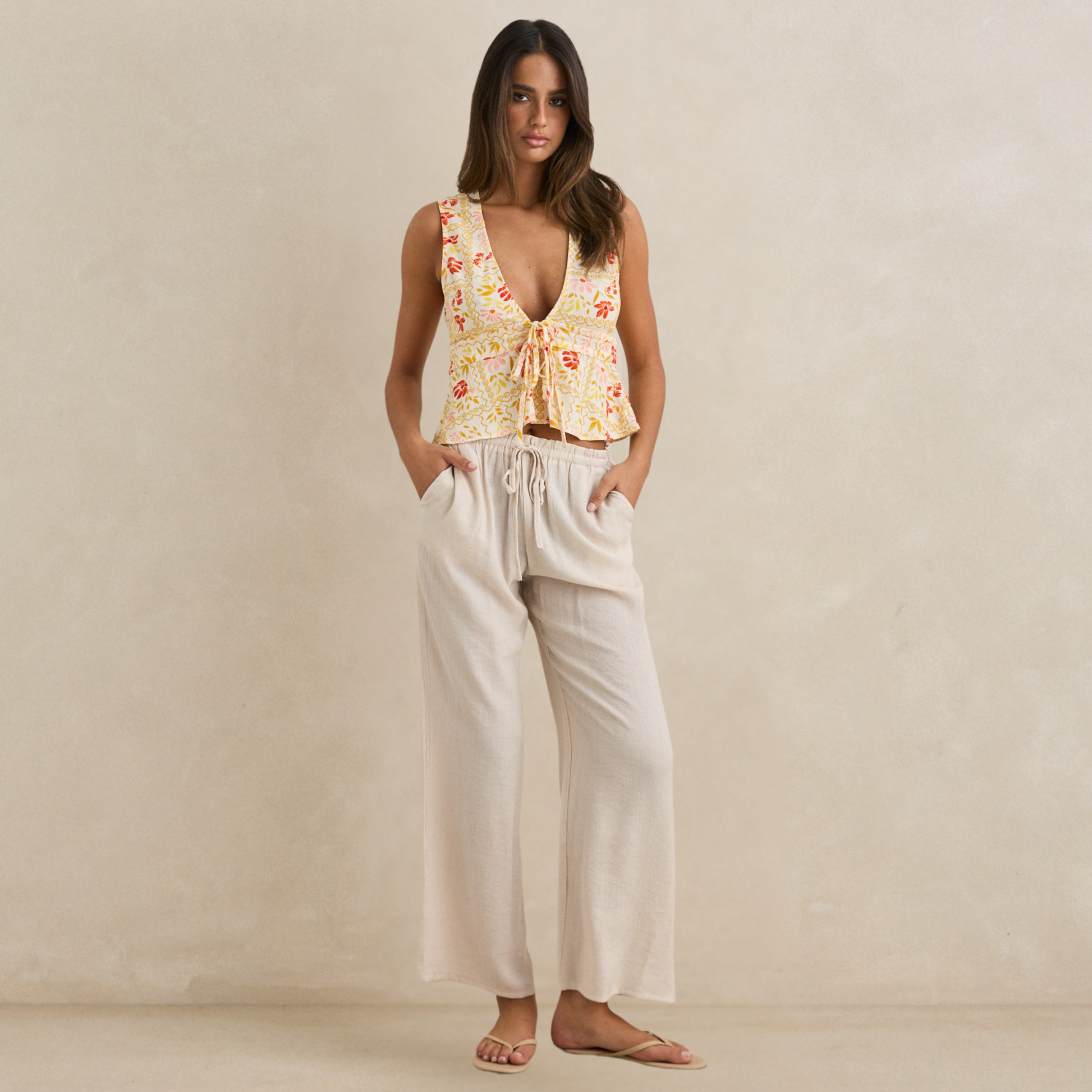 Embrace effortless coastal elegance with the Rhythm Airlie Beach Pant in Ivory. This spring 2026 essential combines a lightweight rayon-nylon blend with soft crinkle texture that moves beautifully against your skin. The mid-rise straight-leg silhouette features an adjustable drawstring waistband and functional side pockets, delivering both comfort and style. Drapey and flowing, it's designed for those sun-soaked days when you want relaxed sophistication—layer it over swimwear or wear solo for understated beach-to-street versatility.