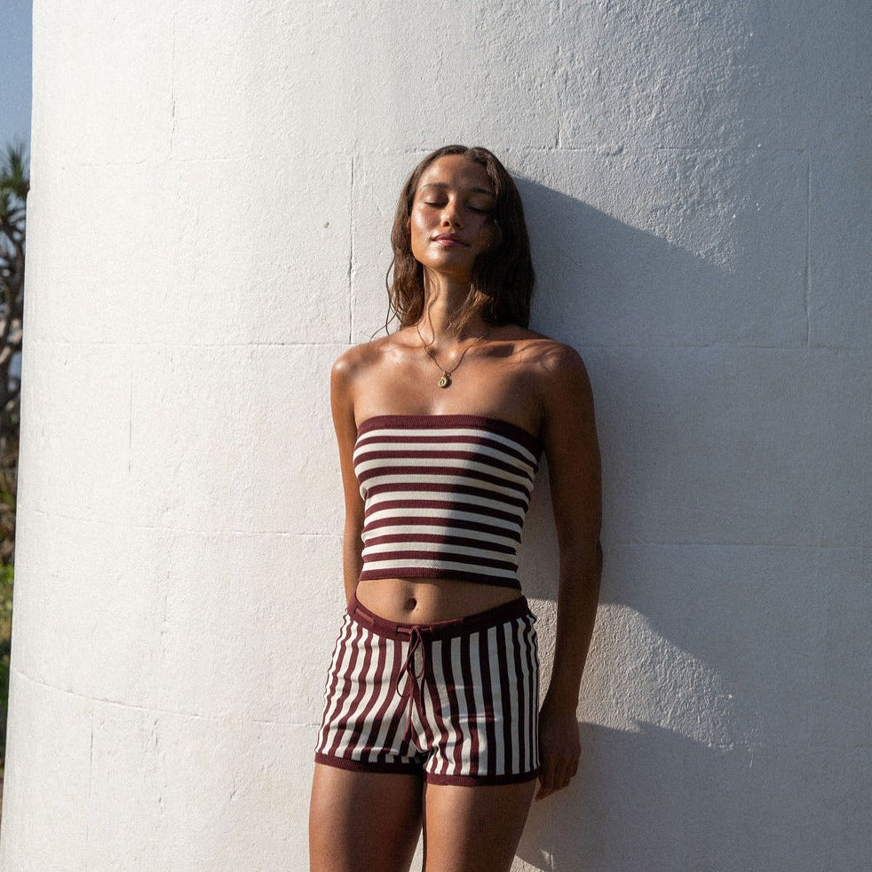 Lightweight and effortlessly chic, this deep red and beige striped bandeau top delivers understated elegance for warm-weather layering. The soft knit fabric hugs your frame with a gentle, form-fitting silhouette while the clean neckline and straight hem create a polished look. A subtle garment wash gives it that naturally relaxed, lived-in aesthetic. Pair it with the Daybreak Micro Knit Short for an easy Florida fall lounge set, or layer a cardigan over top when temperatures drop. Versatile enough for poolside moments or casual evenings out.