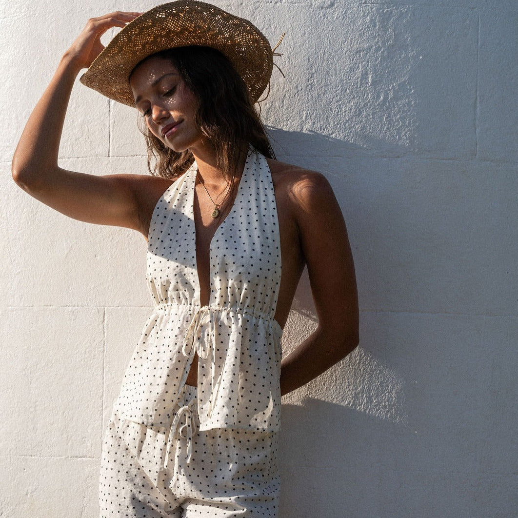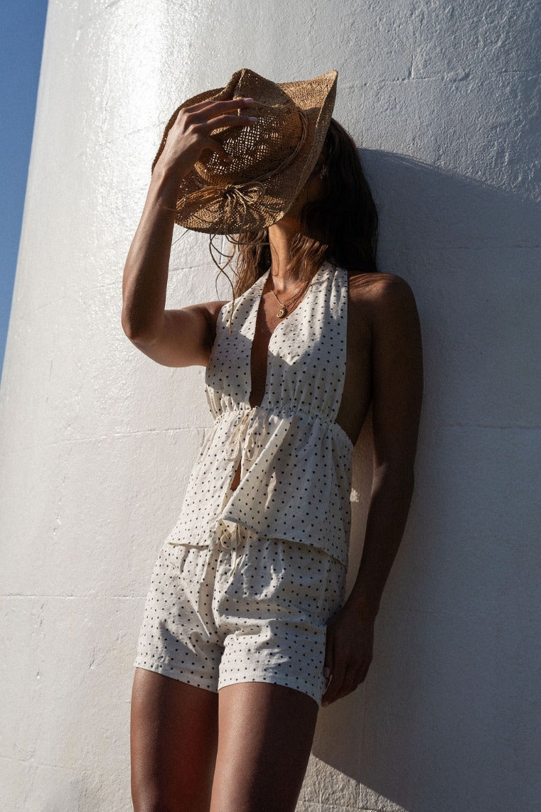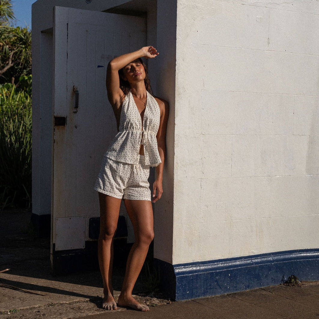 Embrace the polka dot moment with these effortless cream shorts featuring micro black dots. Pair them with the Polka Dot Halter to complete the coordinated look, or layer with a denim jacket when temperatures drop. Perfect for transitioning your beach style through every season—versatile, on-trend, and endlessly wearable.