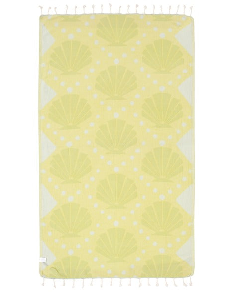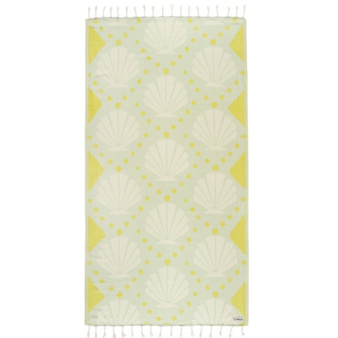 Introducing the Sand Cloud Brizo Towel - Regular. Made with Turkish organic cotton, this towel offers a softer feel and sustainable production. The seashell design and twisted tassels add a touch of elegance, while the sand-resistant material makes it perfect for any beach trip. Measures approx. 37" x 67" and machine washable.