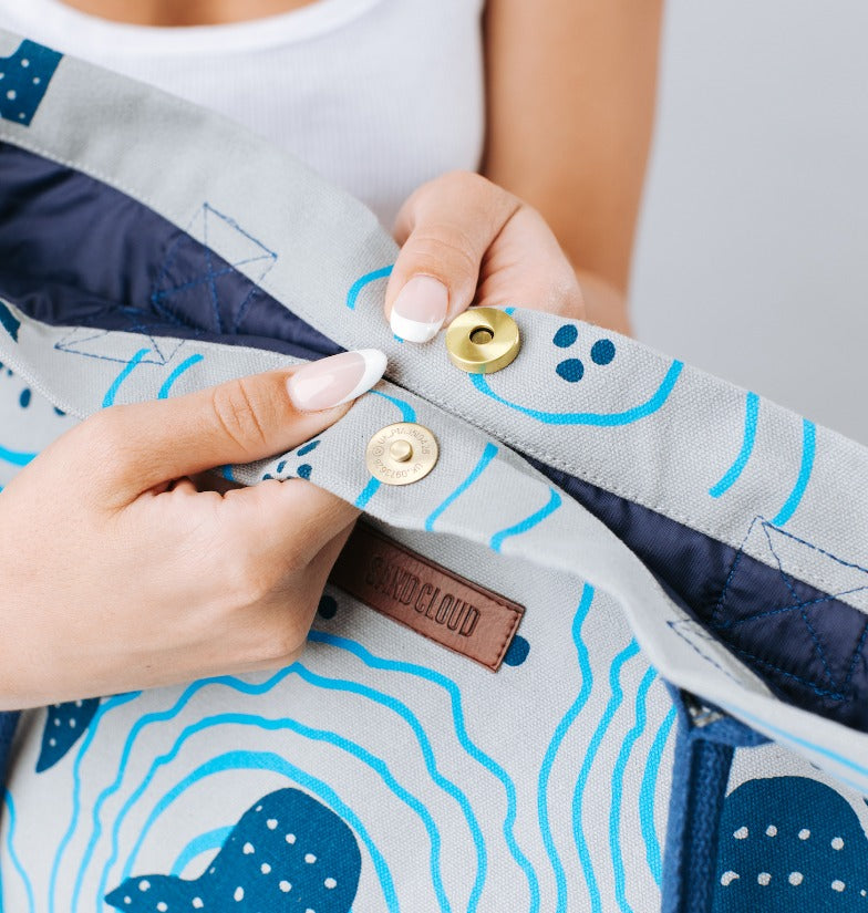 Stay stylish and eco-friendly with our Sand Cloud Shark Ripples Beach Tote! Made from 100% organic cotton, this tote is perfect for any beach or pool day. Show your love for sea turtles while supporting small and local businesses. A must-have for any beach lover.