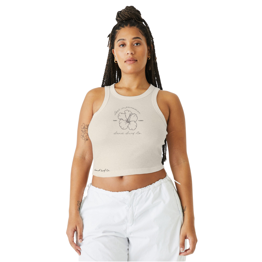 Get lost in paradise with the Sand Surf Co. Lost in Paradise Tank Top. This summer tank from your favorite local surf shop, features a hibiscus design beloved by sandy babes. Visit us in Tampa florida or ship worldwide to ensure good vibes across the globe. Made with a high-quality, sustainable blend of cotton and polyester, this fitted and cropped top features a high neck and 1x1 rib for a flattering fit. Sustainably produced, this tank top is not only fashionable but also environmentally friendly.