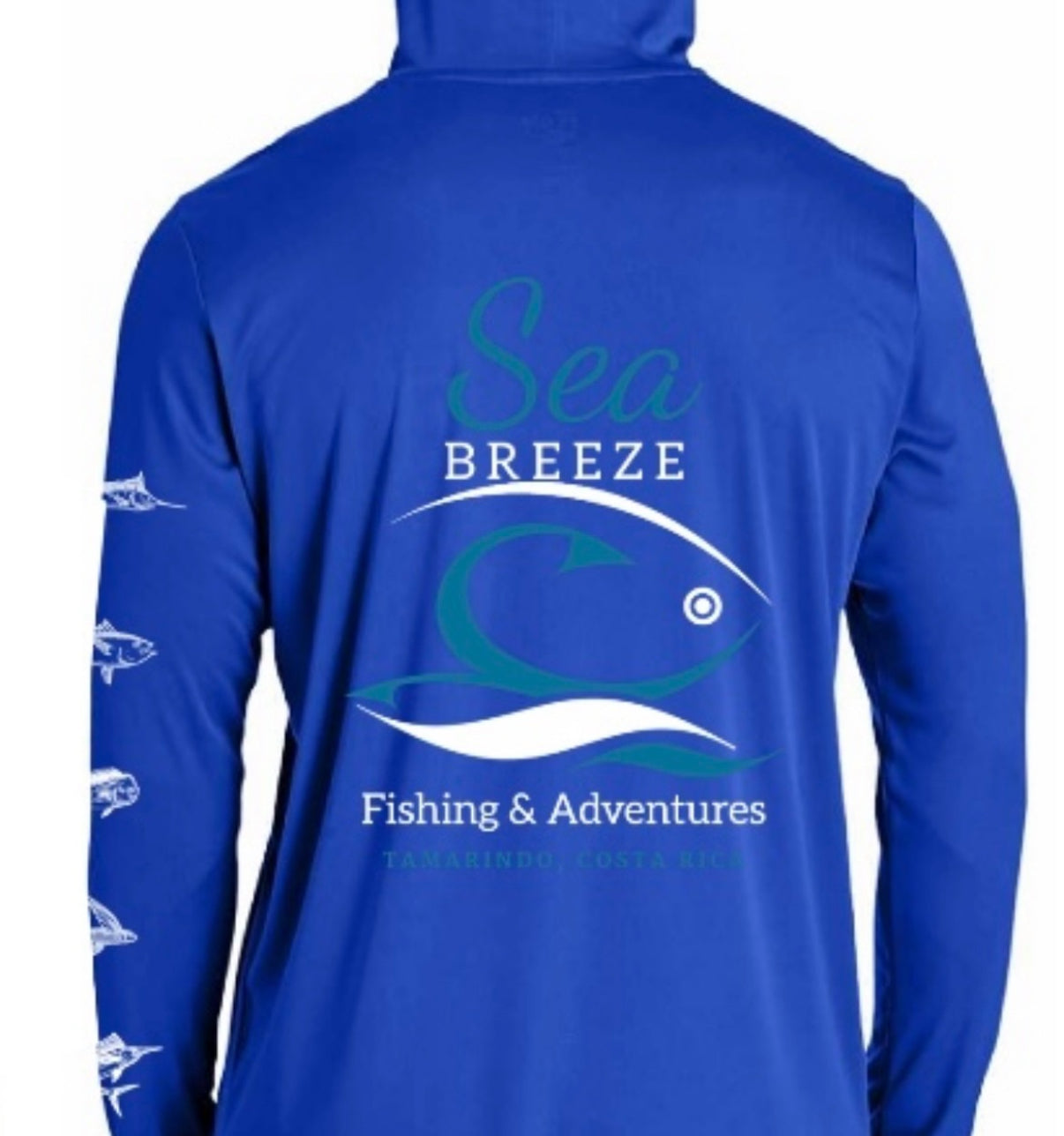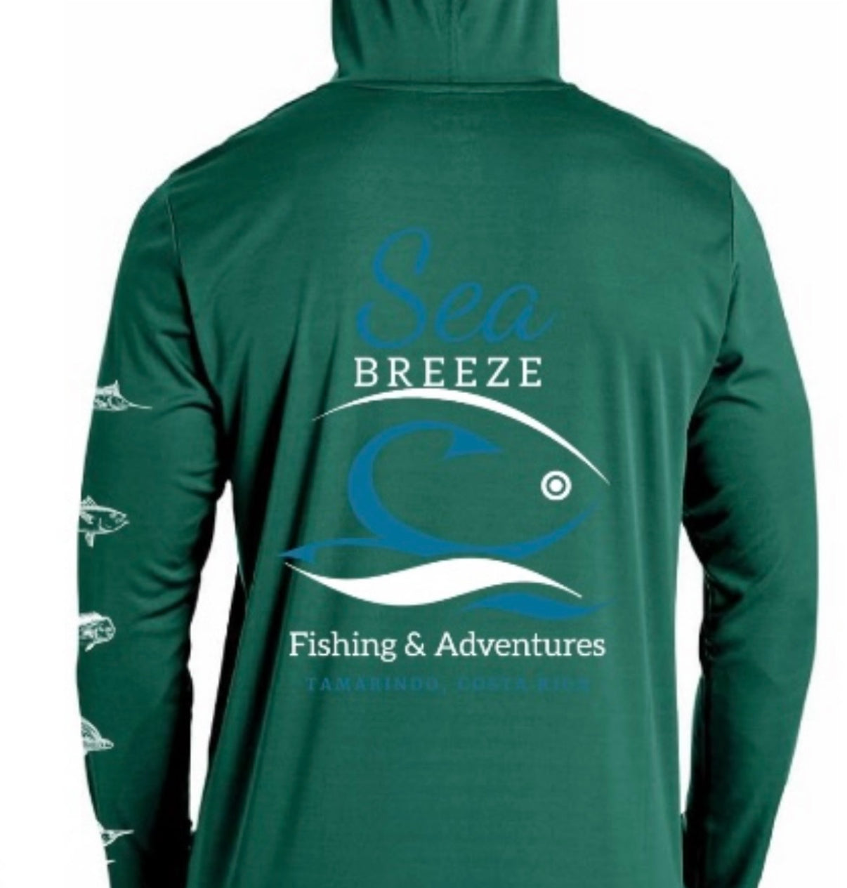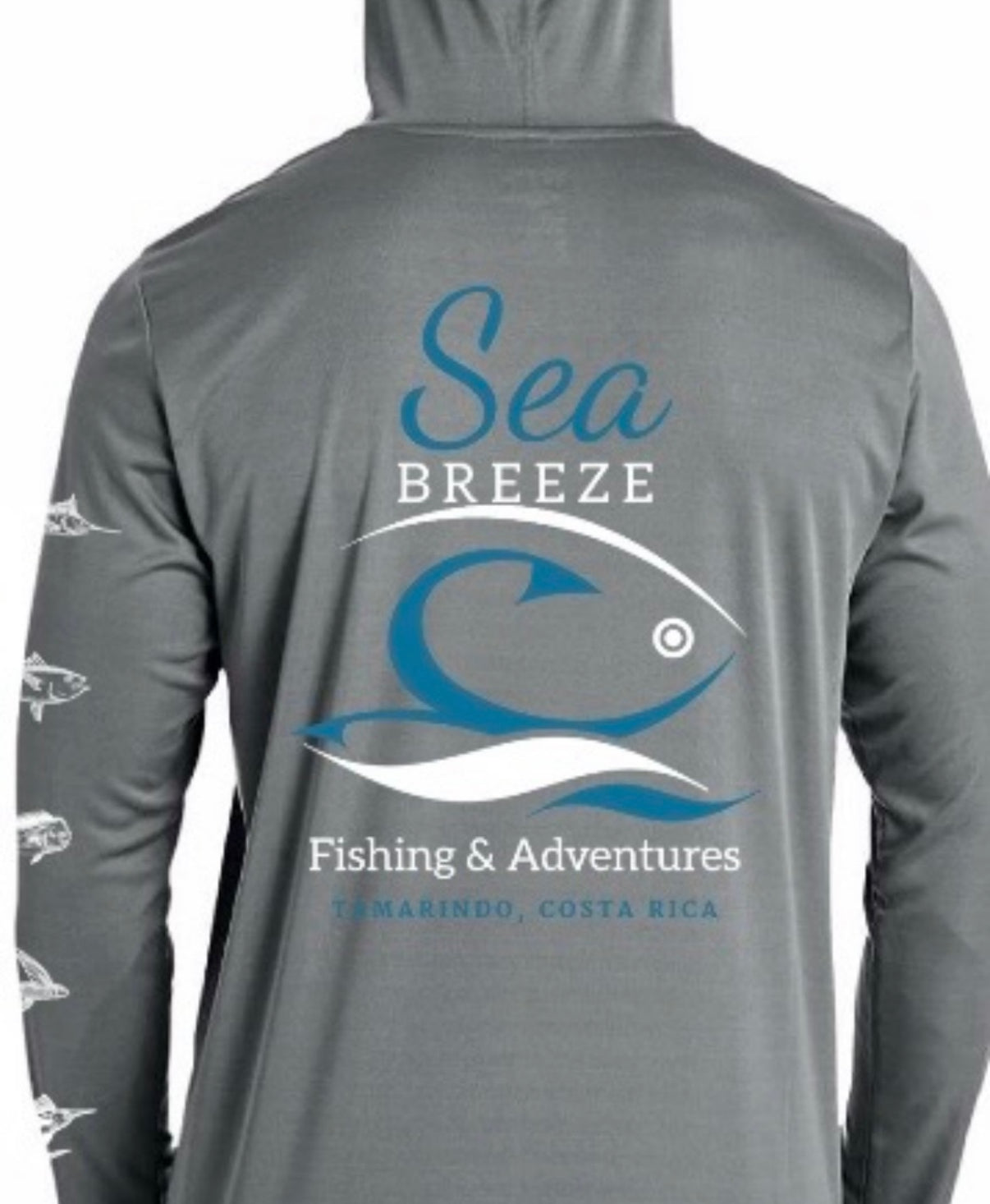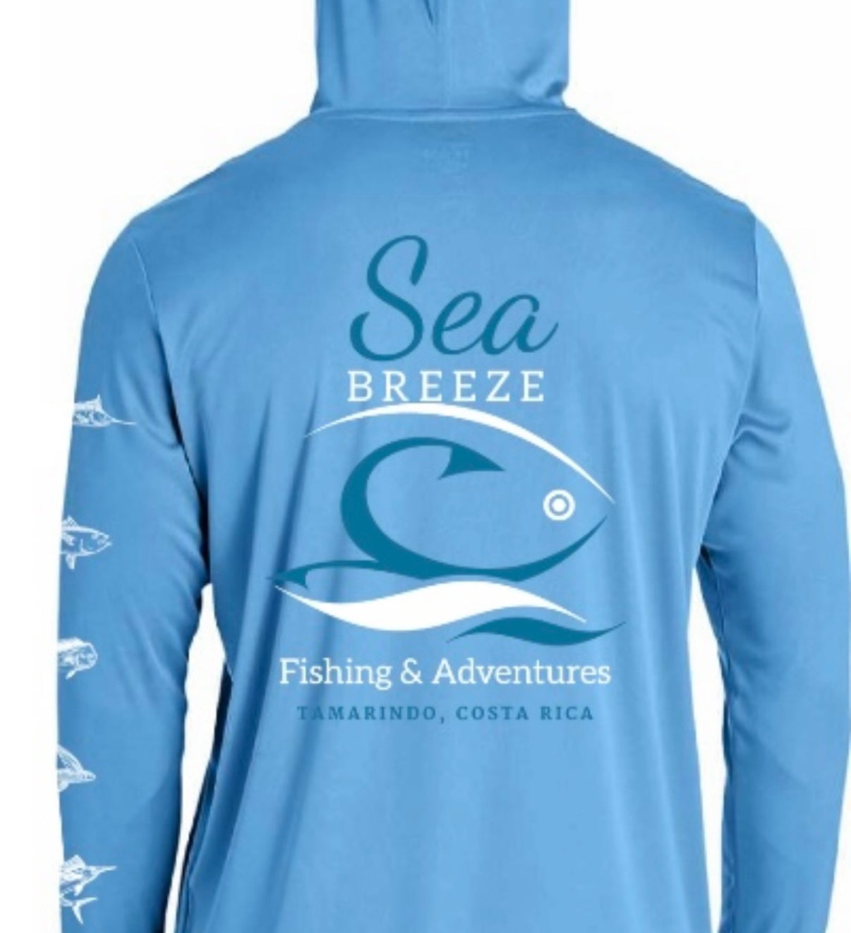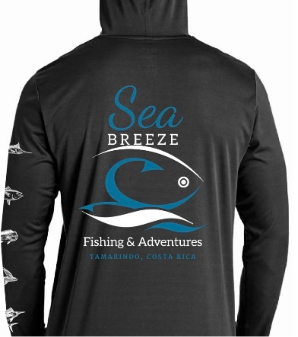 Enjoy extended days on the water with the Seabreeze Hooded UV sunshirt, offering UPF 50 protection to shield your skin from harmful rays with moisture wicking. Its unique fish art design down the sleeve adds a stylish touch, while the hood provides extra coverage and comfort under the sun. Created in partnership with Seabreeze Fishing Tours and Adventures in Tamarindo, Costa Rica, this sunshirt blends functionality with coastal inspiration for your next outdoor adventure.