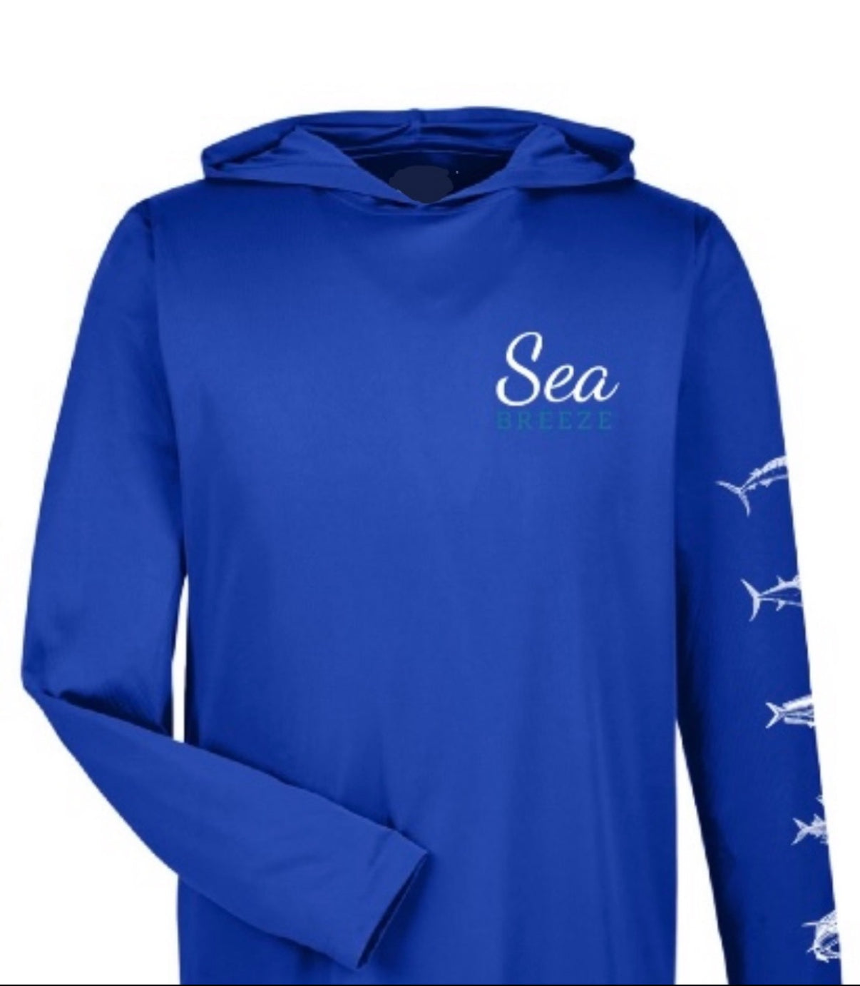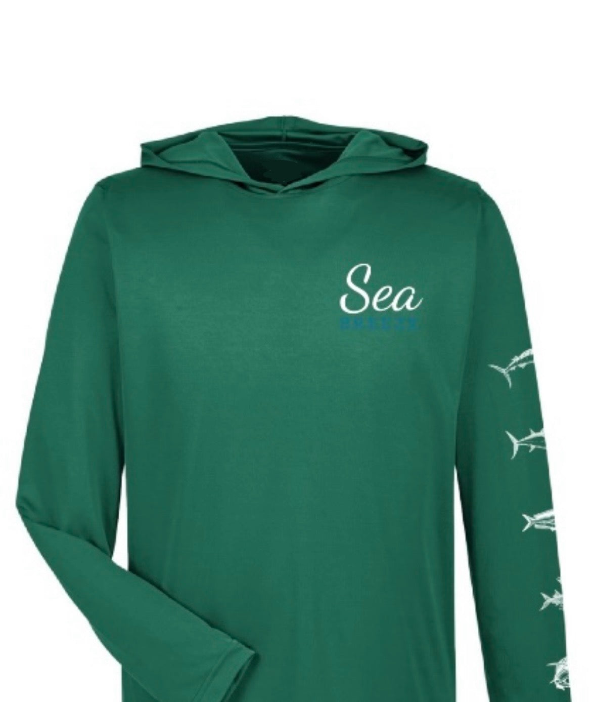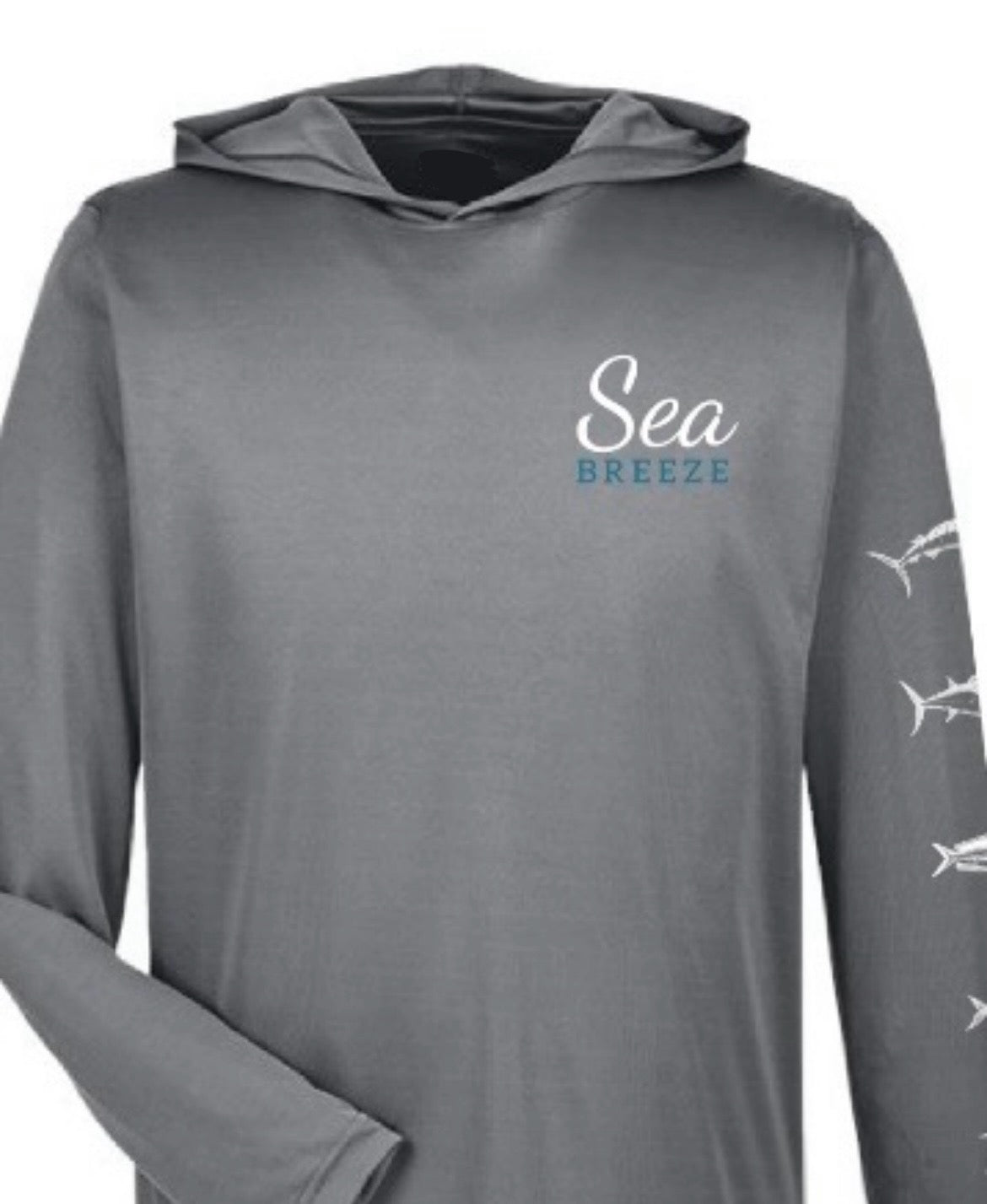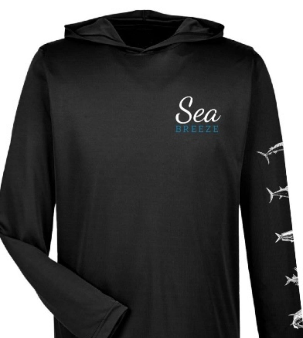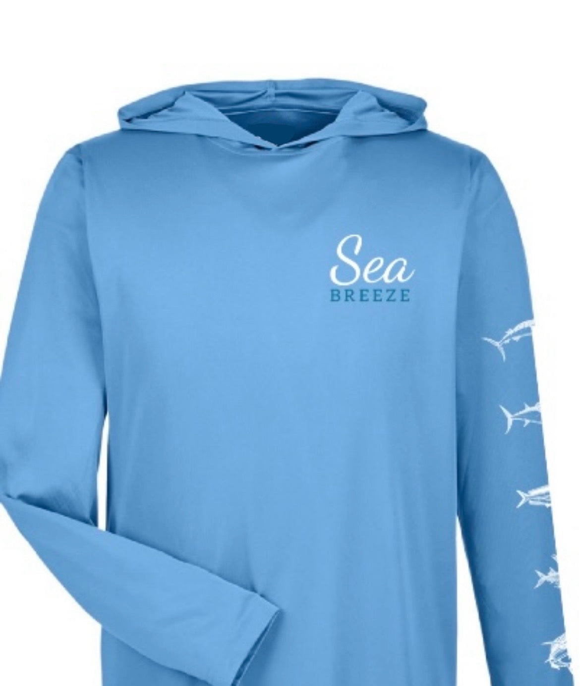 Enjoy extended days on the water with the Seabreeze Hooded UV sunshirt, offering UPF 50 protection to shield your skin from harmful rays with moisture wicking. Its unique fish art design down the sleeve adds a stylish touch, while the hood provides extra coverage and comfort under the sun. Created in partnership with Seabreeze Fishing Tours and Adventures in Tamarindo, Costa Rica, this sunshirt blends functionality with coastal inspiration for your next outdoor adventure.